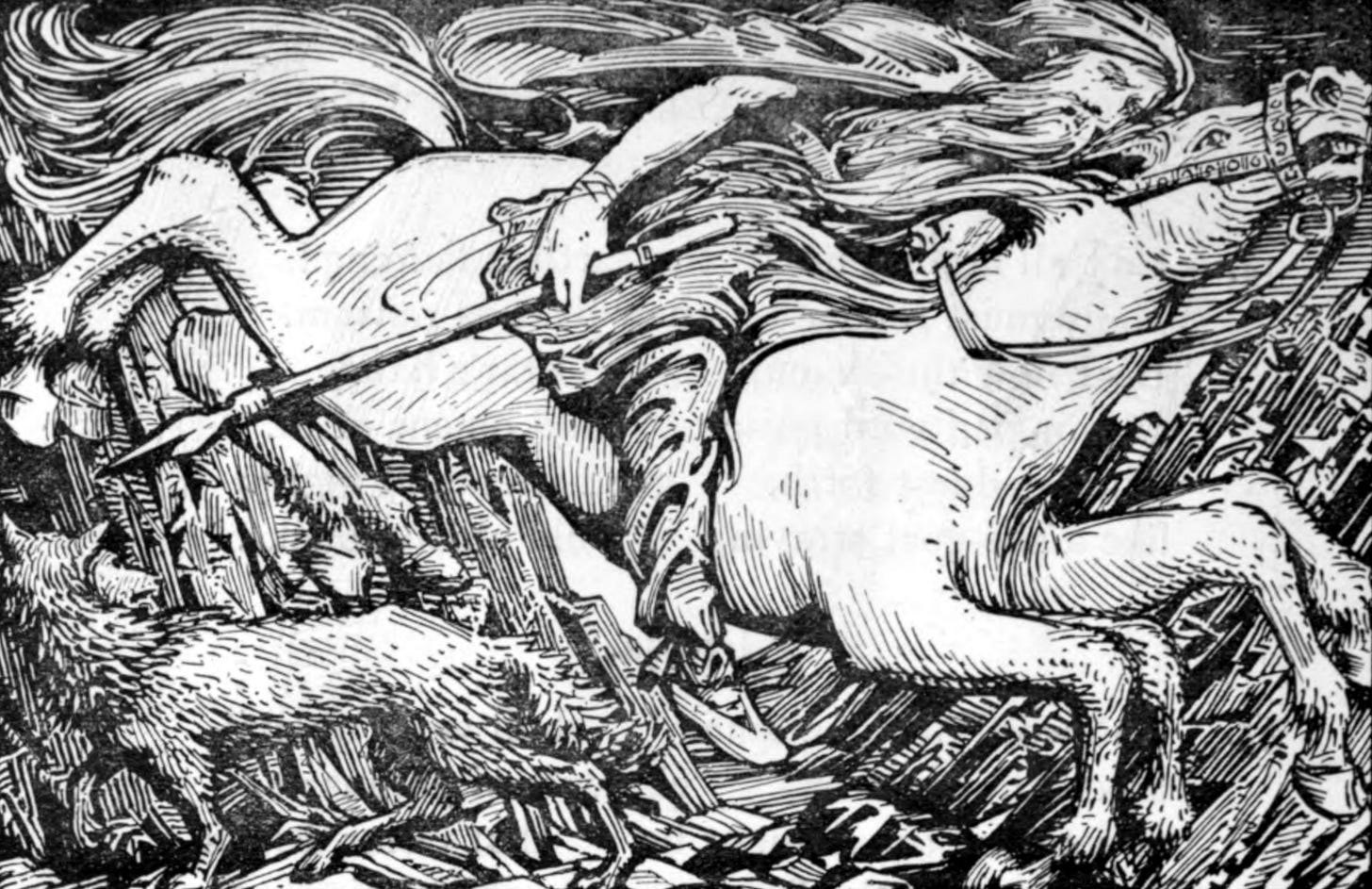 He rode up to the eastern gate where he knew of a grave mound. When he arrived, he took to his staff and hit the ground calling down into the grave whilst he started to sing old spell-songs; songs to stir the grave of a dead witch, the Volva. His incantations forced the spirit to rise from her sleep. Then she spoke: "Long I have been under the stones and grass, who is this stranger calling at my door, forcing me to wake from the long sleep of the dark?"