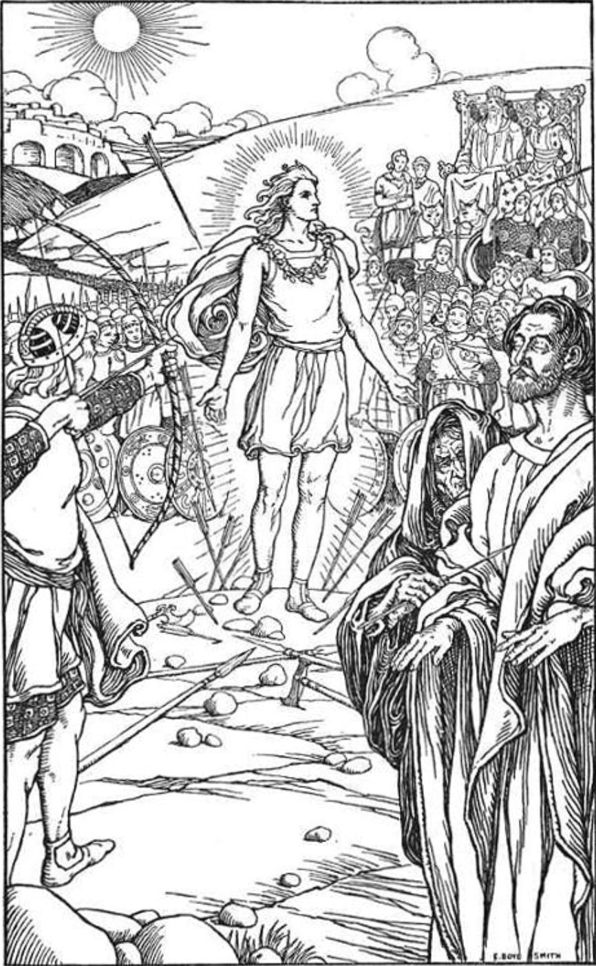 "Here," said Loki, "stand up and I will guide you. I will stretch this great bow for you and point this arrow. Hod held the bow and Loki helped him steady himself, and he carefully placed the arrow above his hand where he could take aim, then he hunkered down and looked through the straight shaft which pointed straight to the chest of beautiful Balder. "Release!" Loki shouted.